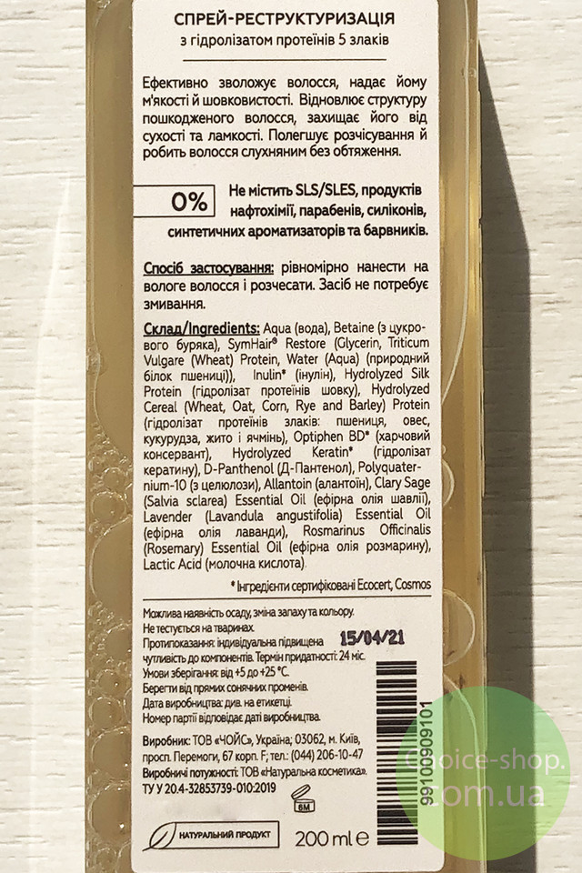 Спрей-реструктуризація з гідролізатами протеїнів п'яти злаків відновлює кератиновий шар волоcся завдяки натуральним гідролізатам білка. Захищає волосся від сухості й ламкості під час застосування різних засобів стайлінгу, а також фену. Полегшує розчісування й робить волосся слухняним без обтяження. Надає неймовірного блиску та об’єму.