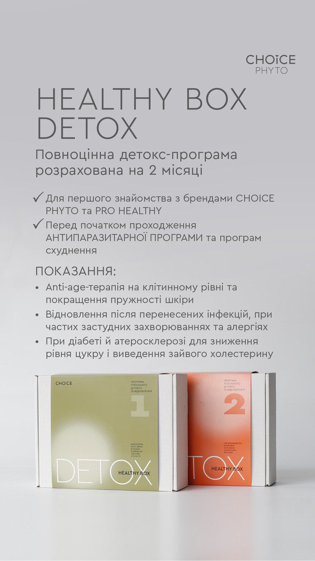 HEALTHY BOX DETOX - автономна повноцінна детокс-програма у два кроки для самостійного виконання, яку слід використовувати один-два рази на рік для підтримки організму у відмінній формі. Виведення токсинів відбувається на клітинному та міжклітинному рівні, що забезпечує швидке й безпечне відновлення всіх органів і систем організму.